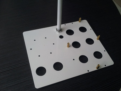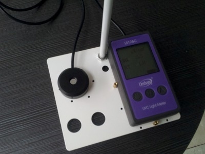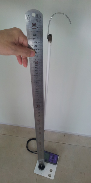 ? ? ?標(biāo)尺掛鉤制作采用一根1m長(zhǎng)的空心鐵管,一邊焊接一段鐵絲作為掛鉤,便于掛在紫外線燈管上。另一段用一塊厚1mm,寬140mm* 長(zhǎng)170mm 的鐵板,作為放置儀器探頭和儀器的平臺(tái)。儀器的探頭上有磁鐵,可以吸在鐵板上,鐵板上固定幾顆銅柱,以便固定儀器,不至于移動(dòng)過程中儀器跌落。