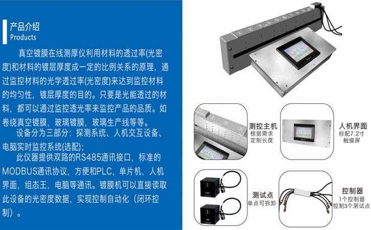 林上真空鍍膜在線測厚儀分為三部分:探測系統(tǒng)、人機(jī)交互設(shè)備、電腦實(shí)時(shí)監(jiān)控系統(tǒng)(選配);儀器提供雙路的RS485通訊接口,標(biāo)準(zhǔn)的MODBUS通訊協(xié)議,方便和PLC,單片機(jī),人機(jī)界面,組態(tài)王,電腦等通訊。鍍膜機(jī)可以直接讀取此設(shè)備的光密度/透過率數(shù)據(jù),實(shí)現(xiàn)控制自動(dòng)化(閉環(huán)控制)。歡迎廣大用戶來電咨詢!0755-27860706