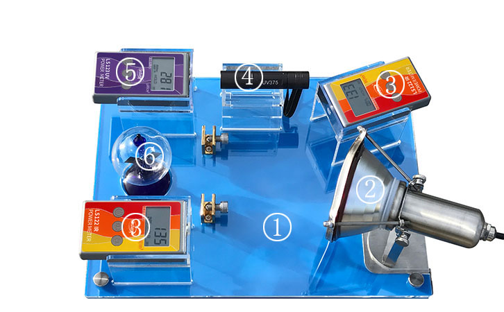 FS2150太陽膜反射測試儀用于展示太陽膜、隔熱玻璃等材料對光線的反射及阻隔效果。紅外線燈對面的LS122紅外功率計用于測試太陽膜,隔熱玻璃等的紅外線阻隔率,即隔熱效果;同側的LS122紅外功率計用于測試太陽膜,隔熱玻璃等的光反射能力大小;LS123紫外功率計測試太陽膜,隔熱玻璃等的隔紫外能力。光強魔鏡用于生動演示隔熱效果,光強魔鏡的葉片旋轉速度和光線的強度成正比。