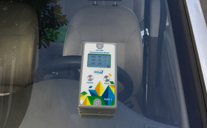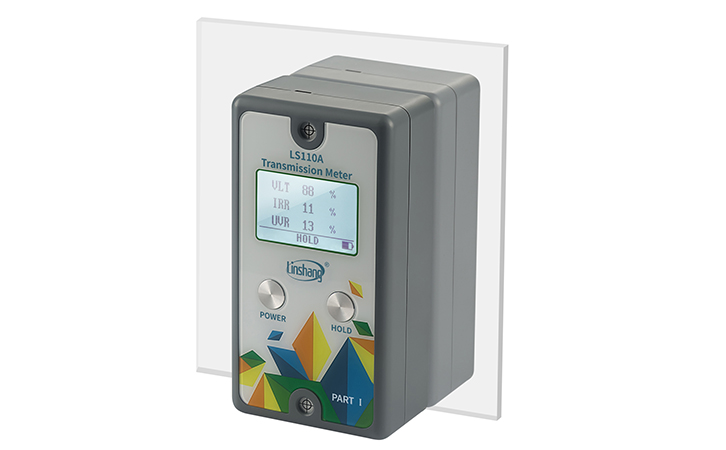 3.測試時,將被測物品夾在主機和副機中間,對準激光靶心,主機屏幕上就會顯示被測材料的VLT(透光率),IRR(紅外線阻隔率),UVR(紫外線阻隔率)。