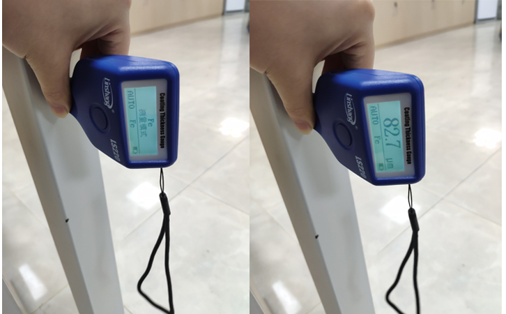 首先使用高精度涂層測厚儀標配的調零板調零,這款儀器無需繁瑣校準,調零就能測。再將儀器探頭垂直按壓在金屬桌腿上,如圖左邊所示,儀器屏幕顯示Fe測量模式,是因為儀器識別到被測材料是鐵基。識別之后,再將儀器提起來,再次垂直按在桌腿上,即可測出它的涂層厚度。