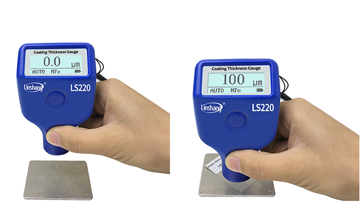 油漆涂層測厚儀LS220,在開始測量時要準備好待測件,按鍵開機后,屏幕上就會顯示上次關機前測量數值。如果想要調零,先將LS220的測頭垂直按壓在待測件的表面,長按儀器上按鍵3秒,根據提示壓緊以及提起探頭,聽到蜂鳴器提示聲,顯示0.0表示調零完畢,可以開始測試了。