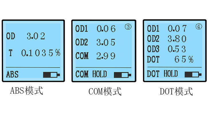 儀器具有3種測量模式,ABS絕對光密度測量模式,COM模式相對光密度測量模式,DOT模式網(wǎng)點面積率測量模式。