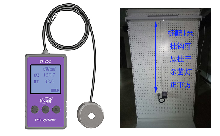 林上LS126C殺菌燈紫外線輻照計標備1米長掛鉤,方便懸掛于殺菌燈下測試,可確保通過國家計量院檢測,一年質保,30天非人為損壞可無理由退換貨。選購定期檢測殺菌燈光照強度的儀器時,林上LS126C紫外線輻照計將會是您的不二之選。