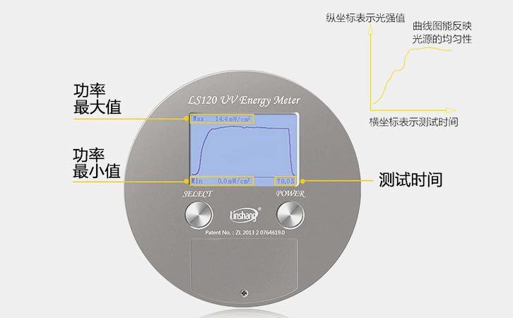 固化傳送帶速度快,光源強度時刻變化的。就要用采集速度快的UV能量表,LS128和LS120的采集速度都是每秒鐘采集2048次,速度非常快,這可以讓能量累積值更加的準確。還能看到固化過程中的功率曲線圖,就是紫外強度在固化過程中的分布狀況。而且UV能量表的精度在優于±10%之間。