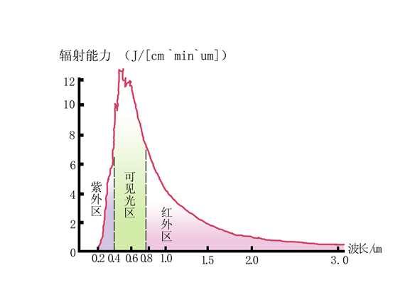 太陽(yáng)光的極為寬闊的連續(xù)譜以及數(shù)以萬(wàn)計(jì)的吸收線和發(fā)射線,是一個(gè)極為豐富的太陽(yáng)信息寶藏。太陽(yáng)光譜屬于G2V光譜型,有效溫度為5770 K。太陽(yáng)電磁輻射中99.9% 的能量集中在紅外區(qū)、可見(jiàn)光區(qū)和紫外區(qū)。在地面上觀測(cè)的太陽(yáng)輻射的波段范圍大約為0.295~2.5um。短于0.295um和大于2.5um波長(zhǎng)的太陽(yáng)輻射,因地球大氣中臭氧、水氣和其他大氣分子的強(qiáng)烈吸收,不能到達(dá)地面。